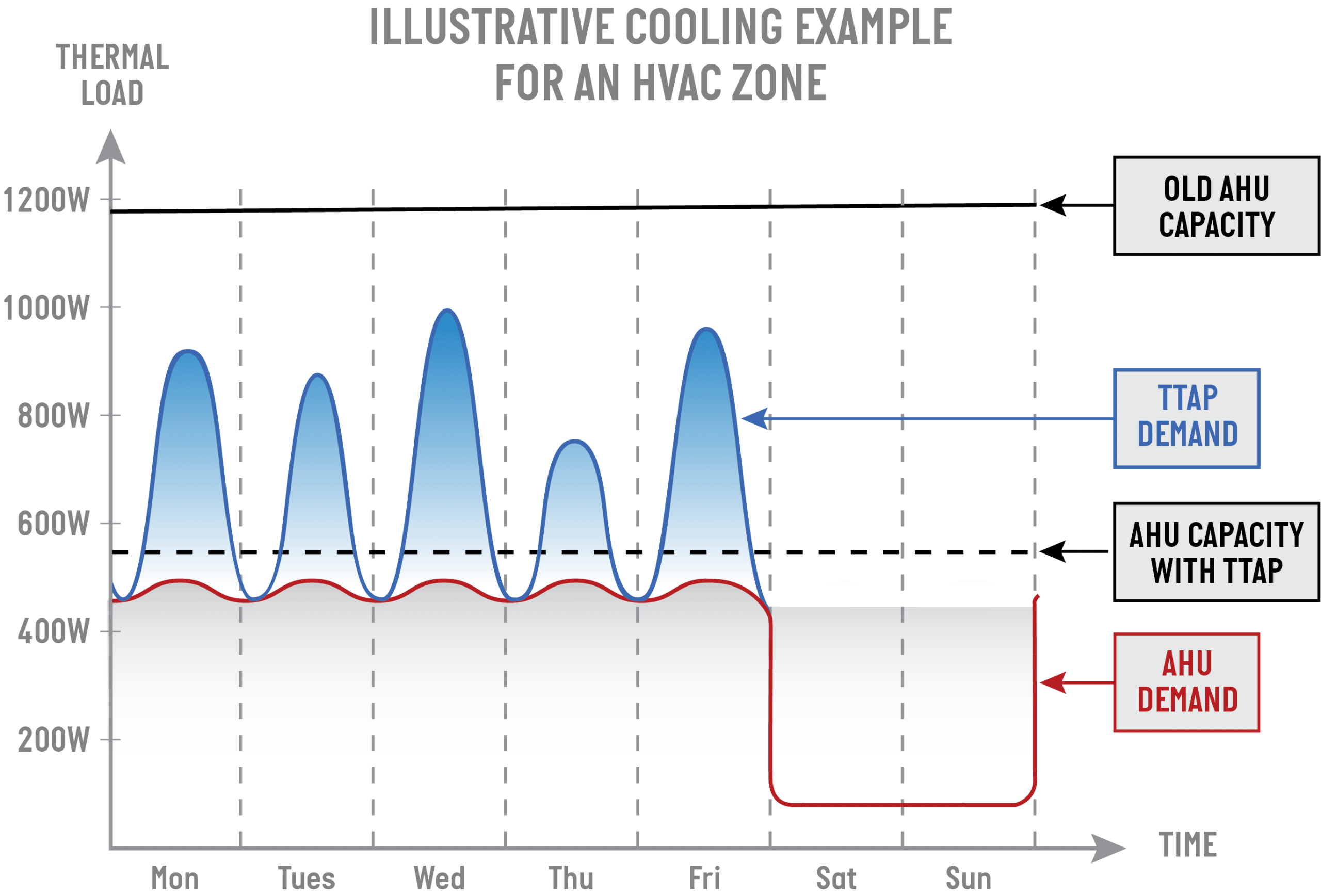 In this configuration, a downsized compressor-based central AHU (noted in red above) runs with minimal variation to offset the thermal baseload. This represents optimal efficiency for the AHU. For real-time demand fluctuations that occur frequently, but for which the central AHU is not optimally designed, the TTAP unit operates (noted in blue above) and delivers the necessary heating / cooling within its optimal COP.